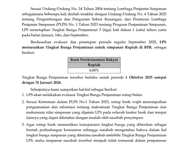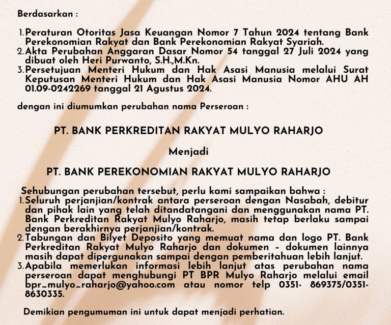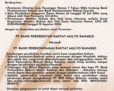 Berdasarkan POJK no 7 tahun 2024 tentang Bank Perekonomian Rakyat Dan bank Perekomonian Rakyat Syariah. Maka Perubahan Nama PT Bank Perkreditan Rakyat Mulyo Raharjo Menjadi PT Bank Perekonomian Rakyat Mulyo Raharjo Dan Segala Yang berkaitan dengan Hal tsb dapat di cek DI Link Berikut